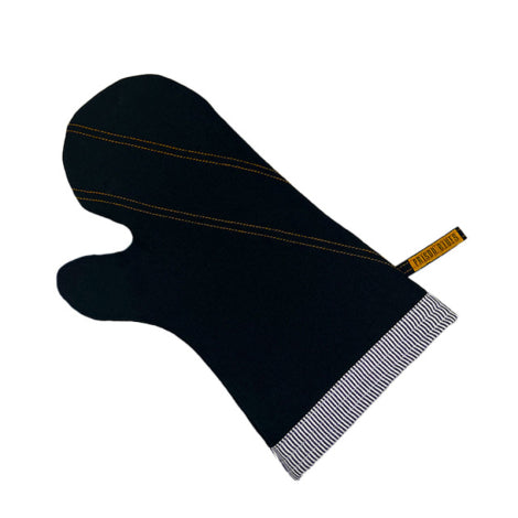 Crafted from durable 13.75 oz. American Black Denim and 8 oz. Hickory with added starch, this oven mitt offers long-lasting strength and resilience. Its lining, made from a 70% acrylic and 30% polyester blend, provides reliable heat protection, making it ideal for handling hot cookware safely. Combining rugged materials with practical design, this mitt is a dependable choice for any kitchen task, from baking to grilling. Show your brand loyalty while keeping your hands protected with this expertly constructed oven mitt.