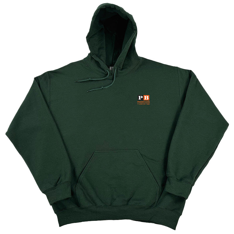 The Pull Over Hooded Sweatshirt in Forest Green features a striking white, black, and orange letter block logo, combining style with durability. Made from an 8-ounce blend of 50% cotton and 50% polyester, it offers reliable warmth and long-lasting comfort. Ideal for layering in cooler weather, this hoodie balances robust construction with a bold design, making it a versatile addition to any wardrobe.