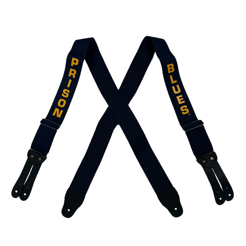 Prison Blues Suspenders feature a durable X-back design measuring 54 inches for a secure, comfortable fit. Equipped with flat leather ends, they ensure reliable hold throughout your workday. The gold ink "Prison Blues" branding adds a distinctive touch, combining functionality with subtle style. Ideal for those seeking dependable support and a professional look in their workwear.